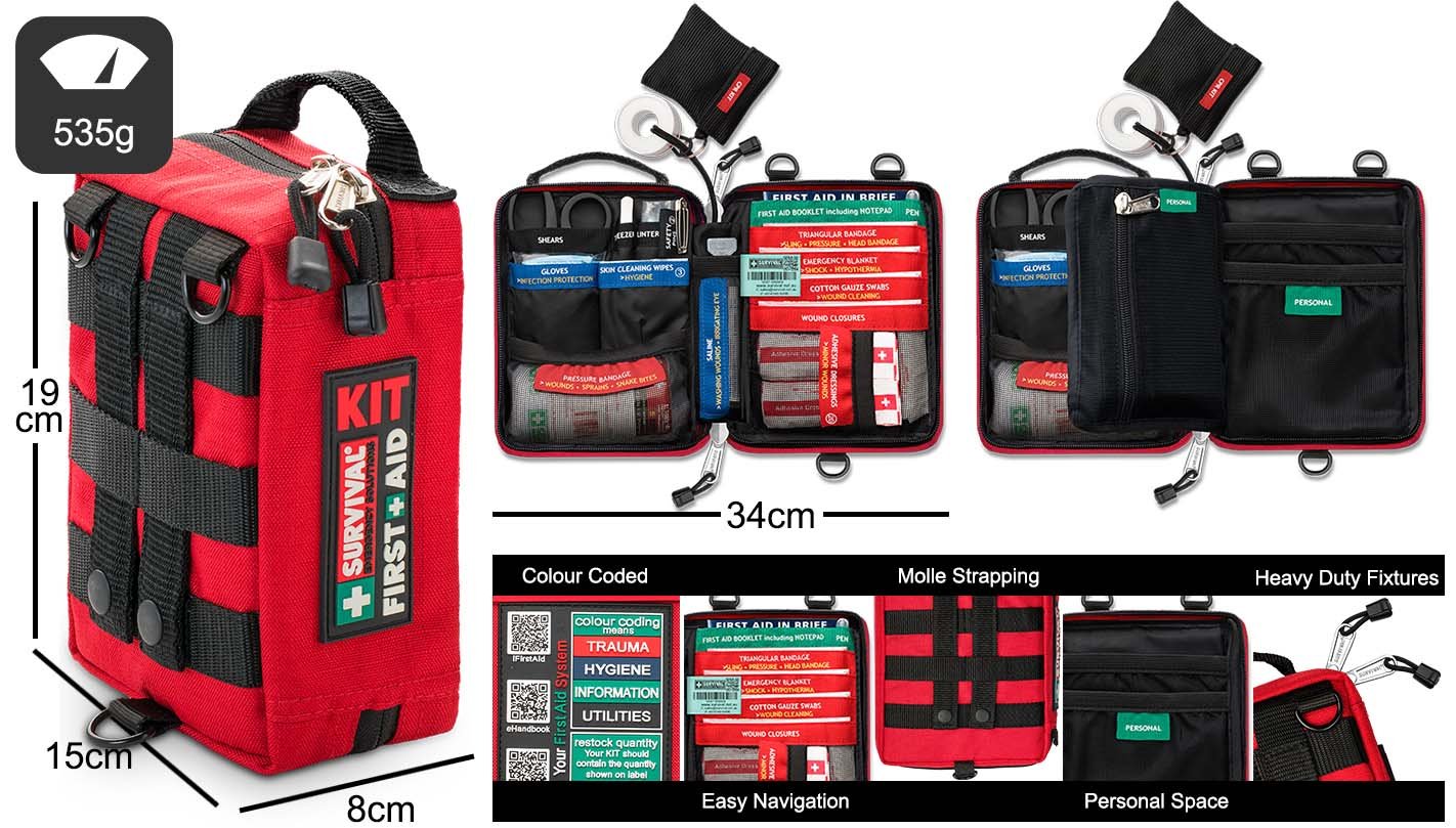 Designed to be portable enough to be with you on the go, this compact first aid kit weighs just under 500 grams, yet still contains a SMART Snake Bandage and Pocket CPR KIT , as well as gloves, saline, antiseptic wipes and a resuscitation shield, shears, a first aid instruction booklet, tweezers, wound closures and lots more.