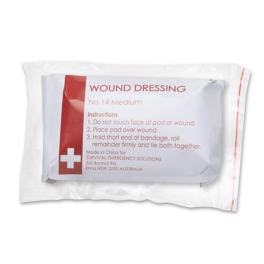 Wound dressing, 14 (medium) is an absorbent pressure pad, 20cm x 15cm, attached to a gauze bandage, 2.5m in length