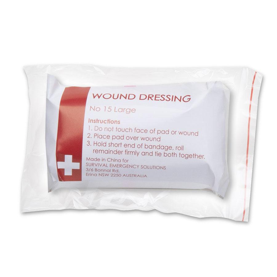 | Wound dressing,15 (large) is an absorbent gauze pressure pad, 20cm x 20cm, attached to a gauze bandage, 2.5m in length |
